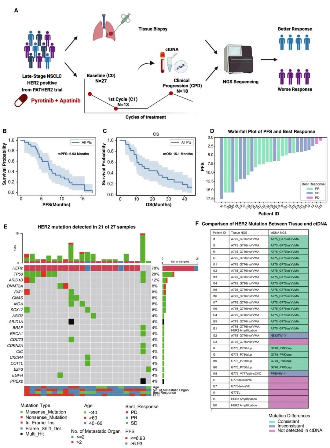 本研究纳入了来自 PATHER2 研究的 27 名携带 HER2 突变/扩增的晚期 NSCLC 患者,这些患者至少一线化疗或 HER2 靶向治疗失败。试验中,患者每日口服 400 mg 吡咯替尼和 250 mg 阿帕替尼,直至疾病进展、不可逆毒性或死亡。在基线 (n = 27)、一个治疗周期后 (n = 13) 和疾病进展时 (n = 18) 收集外周血样本进行 ctDNA 靶向测序 (图 1.A)。中位随访时间为 41.1 个月,中位无进展生存期 (progression-free survival,PFS) 为 6.93 个月 (图 1.B),中位 OS 为 15.1 个月 (图 1.C)。初始评估时 13 名患者达到部分缓解 (PR),12 名患者疾病稳定 (SD),2 名患者疾病进展 (PD) (图 1.D)。