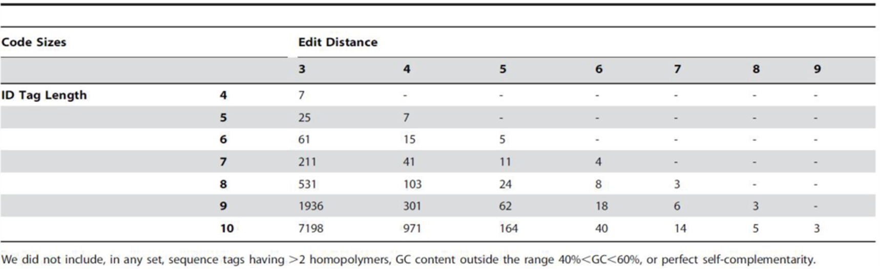 Table 2. Counts of four to 10 nucleotide, ≥ 3 edit distance sequence Indexes sets designed using EDITTAG.