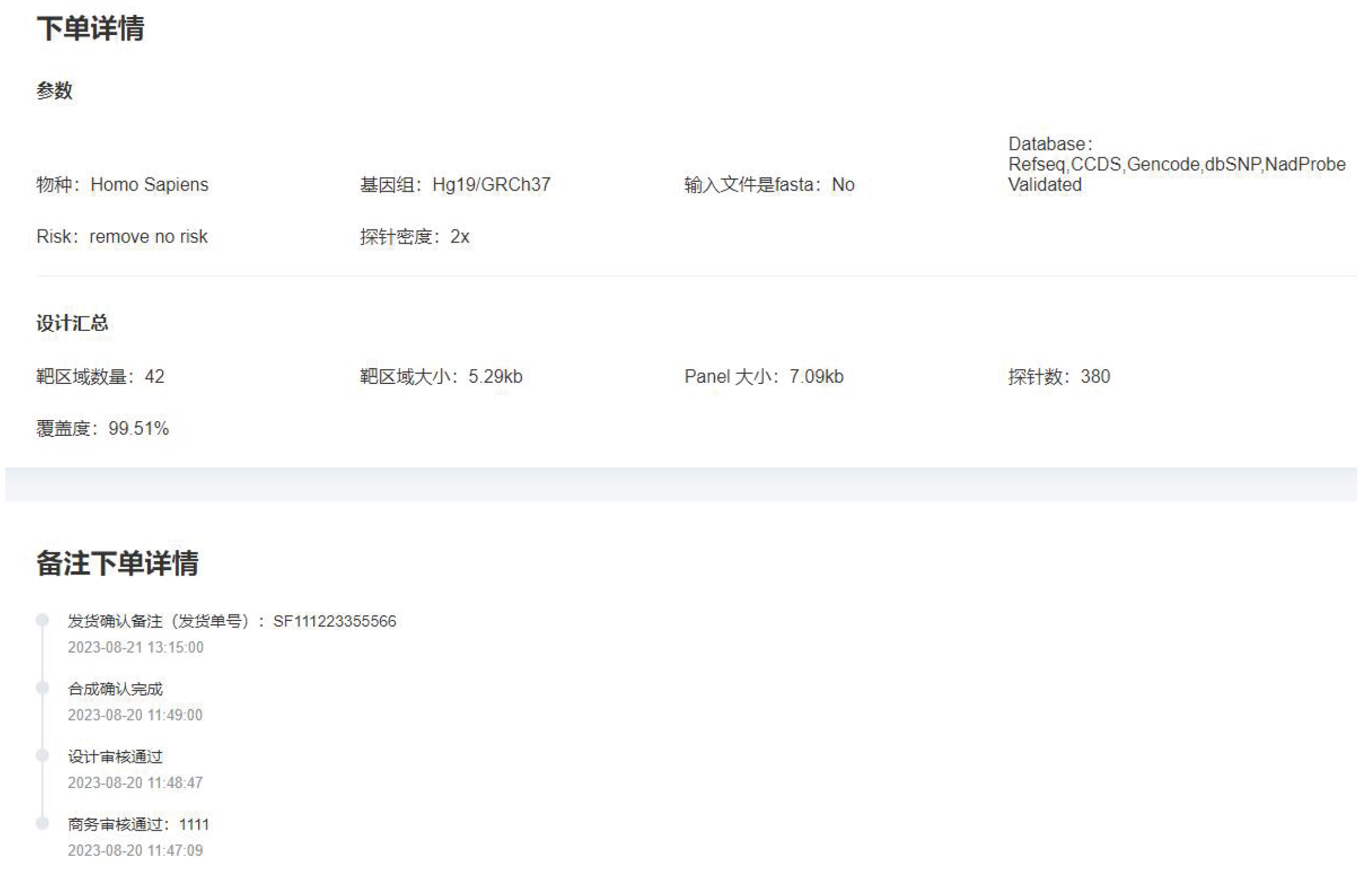 03 复制设计升级 为高效重复使用已完成的设计订单,此次升级特别优化了复制设计功能。点击“复制设计”按钮 (见设计列表和下单列表示意图),系统将自动复制出与原设计参数完全相同的全新设计订单,用户可以轻松地创建相同的设计。 此外,新版设计系统还引入了“上一步”按钮,点击可返回到上一步,自由调整设计参数,灵活修改以满足个性化的需求。 04 新增 fasta 格式输入的风险探针评估功能 对于 Level 3 及以上的用户,若以 fasta 格式文件作为探针设计的输入,设计结果将经过探针风险评估,提示相关的 fasta 探针风险。 05 外部 API 接口全新加入探针设计更灵活 为了满足用户的需求,我们为【XCapert 探针设计平台】提供了 API 接口。现在,用户可通过网站账户登录,借助 API 访问提交输入文件进行探针设计。此 API 接口使用户能更轻松、迅速进行探针设计,获取探针订单状态信息,免除额外操作步骤。我们将持续优化此功能,确保用户轻松获得所需探针设计。 以上即为本次【XCapert 探针设计平台】升级更新的全部内容。非常期待您来体验这些新功能!不论您是探针设计领域专家还是初学者,我们提供更便捷、优化的工具和接口,以满足您的需求。快来尝试一下吧,让我们共同体验更高效、更创新的探针设计平台!如有任何问题或意见,随时欢迎您的反馈。