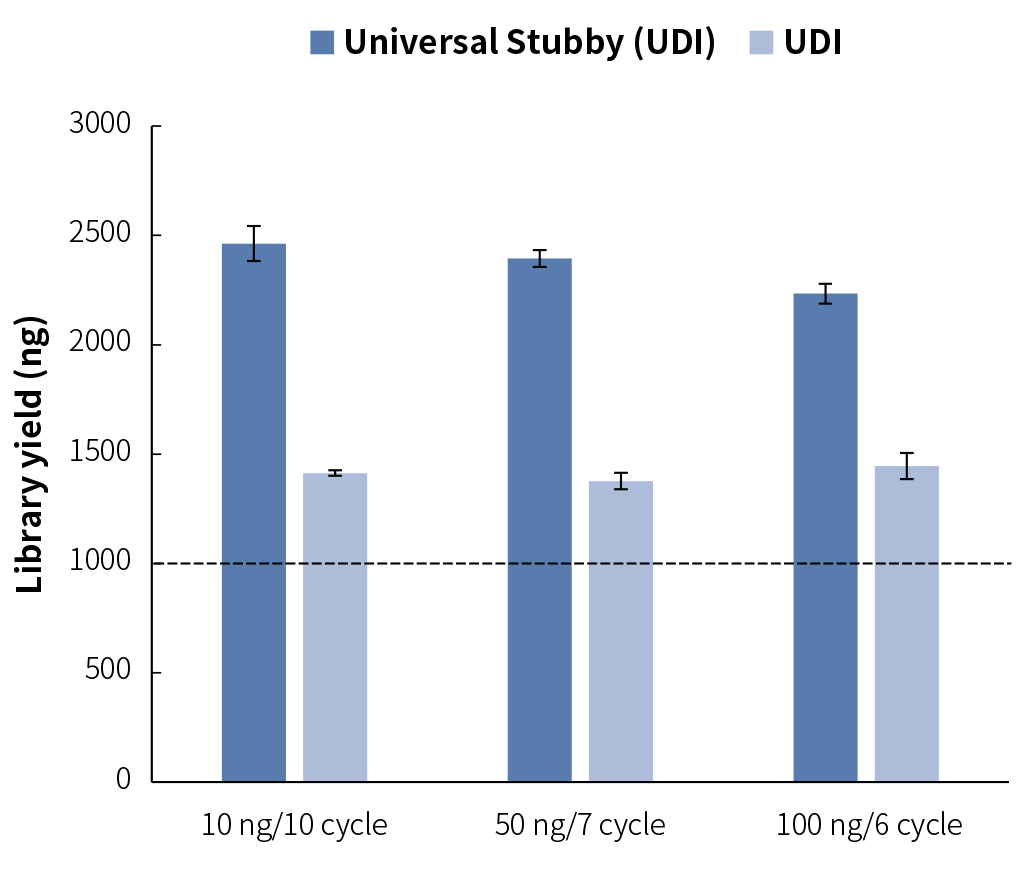 Stubby Adapter (UDI) 构建文库的产量。10 ng片段化 gDNA,按 NadPrep® DNA Library Preparation
