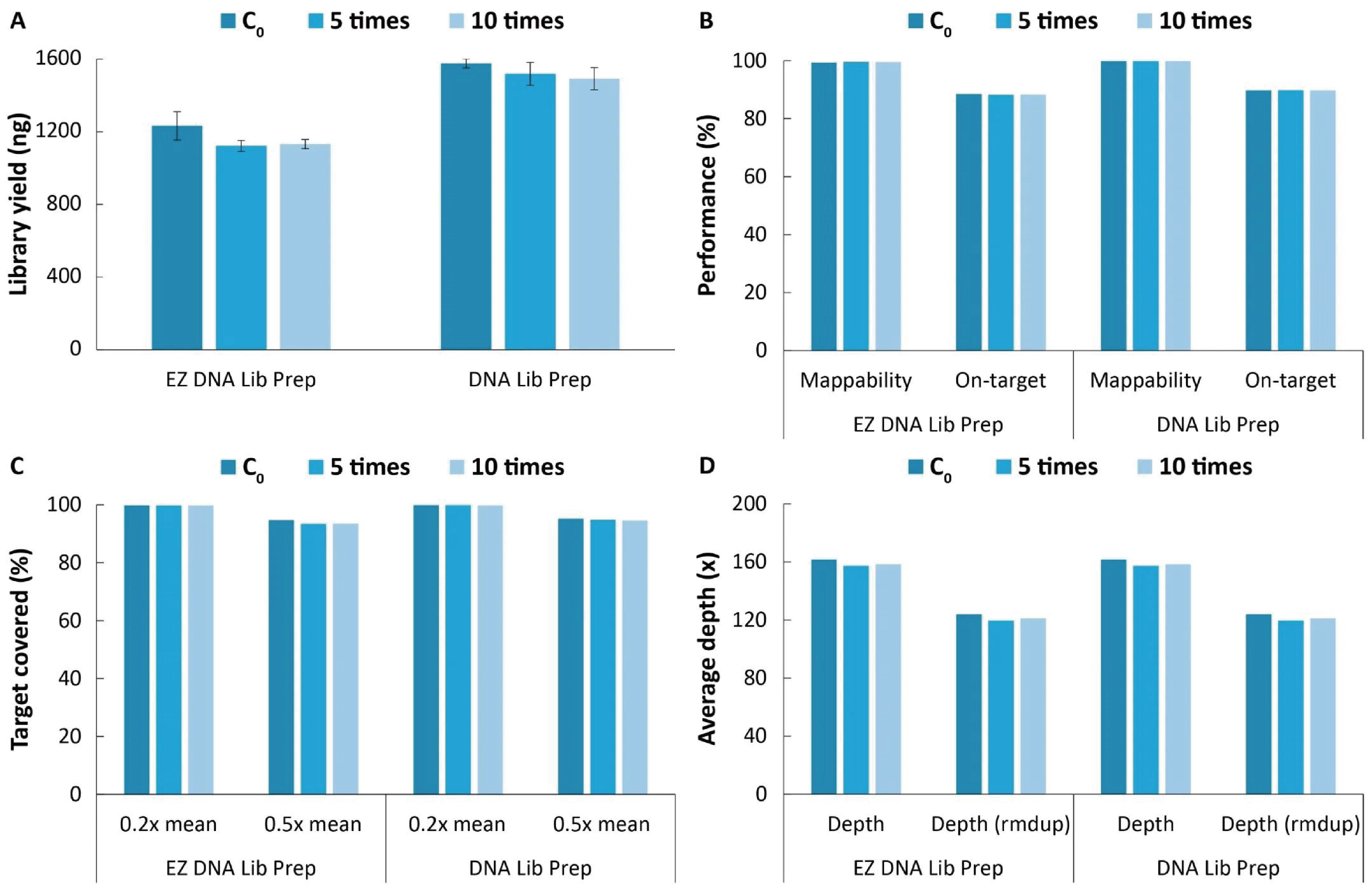 NadPrep® 系列 DNA 文库构建板式试剂盒经过反复冻融 0 次、5 次和 10 次后,与起始点 (C0) 相比,在文库产出、捕获数据比对率和中靶率,靶区域覆盖度和平均测序深度等性能指标上基本保持一致 (图 1.)。