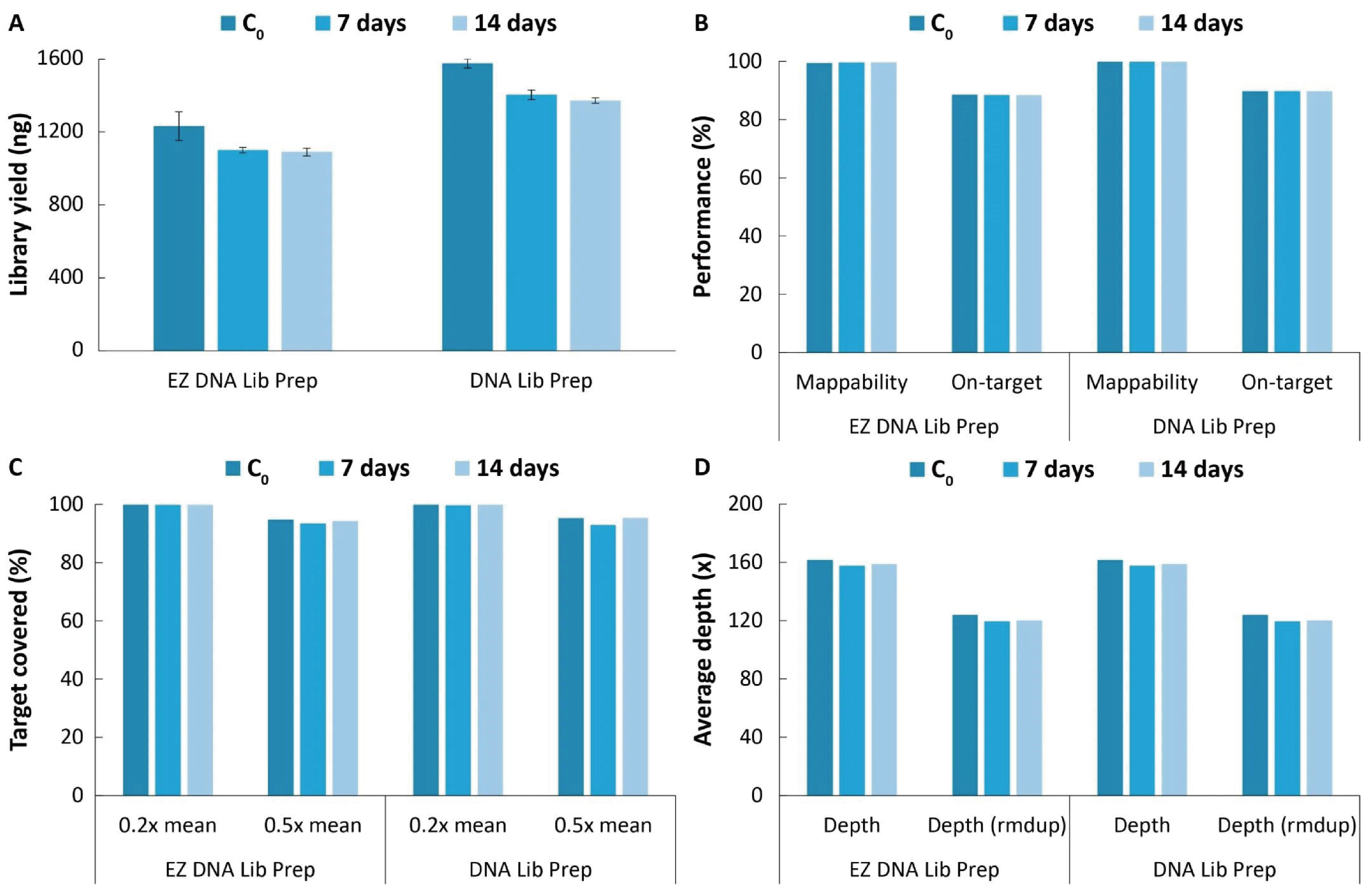 NadPrep® 系列 DNA 文库构建板式试剂盒于 4℃ 下放置 0 天、7 天和 14 天后,与起始点 (C0) 相比,在文库产出、捕获数据比对率和中靶率、靶区域覆盖度和平均测序深度等性能指标上基本保持一致 (图 2.)。