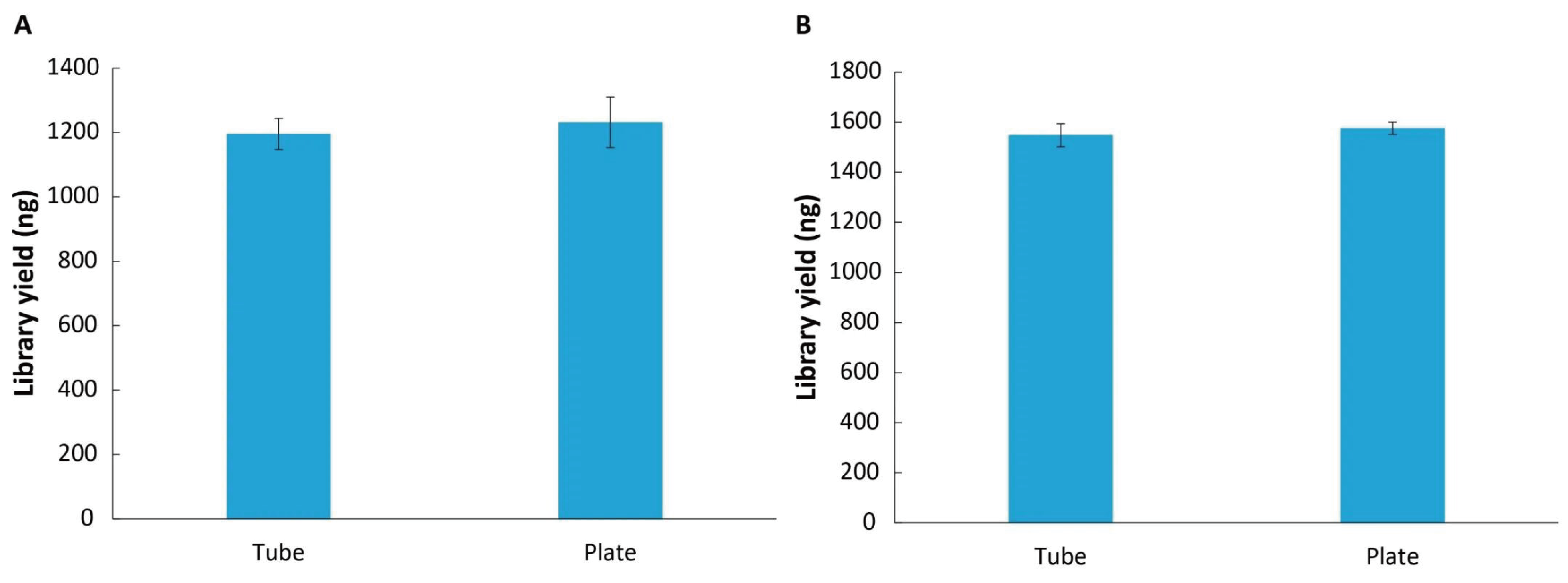 图 3. NadPrep® 系列 DNA 文库构建板式试剂盒与管式试剂盒在预文库产出上表现基本一致。A. NadPrep® 快速 DNA 酶切文库构建试剂盒 (Tube & Plate);B. NadPrep® DNA 文库构建试剂盒 (Tube & Plate)。