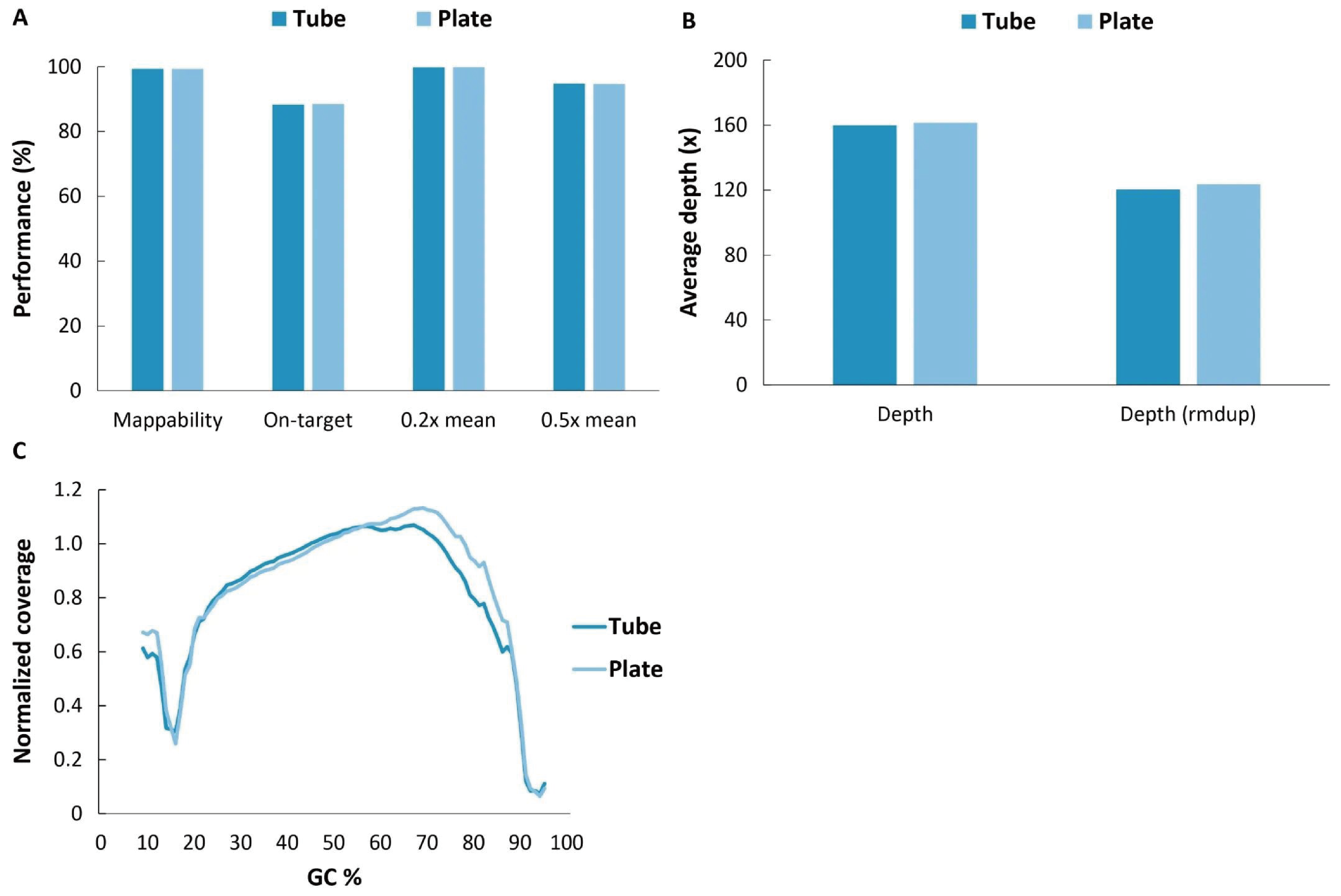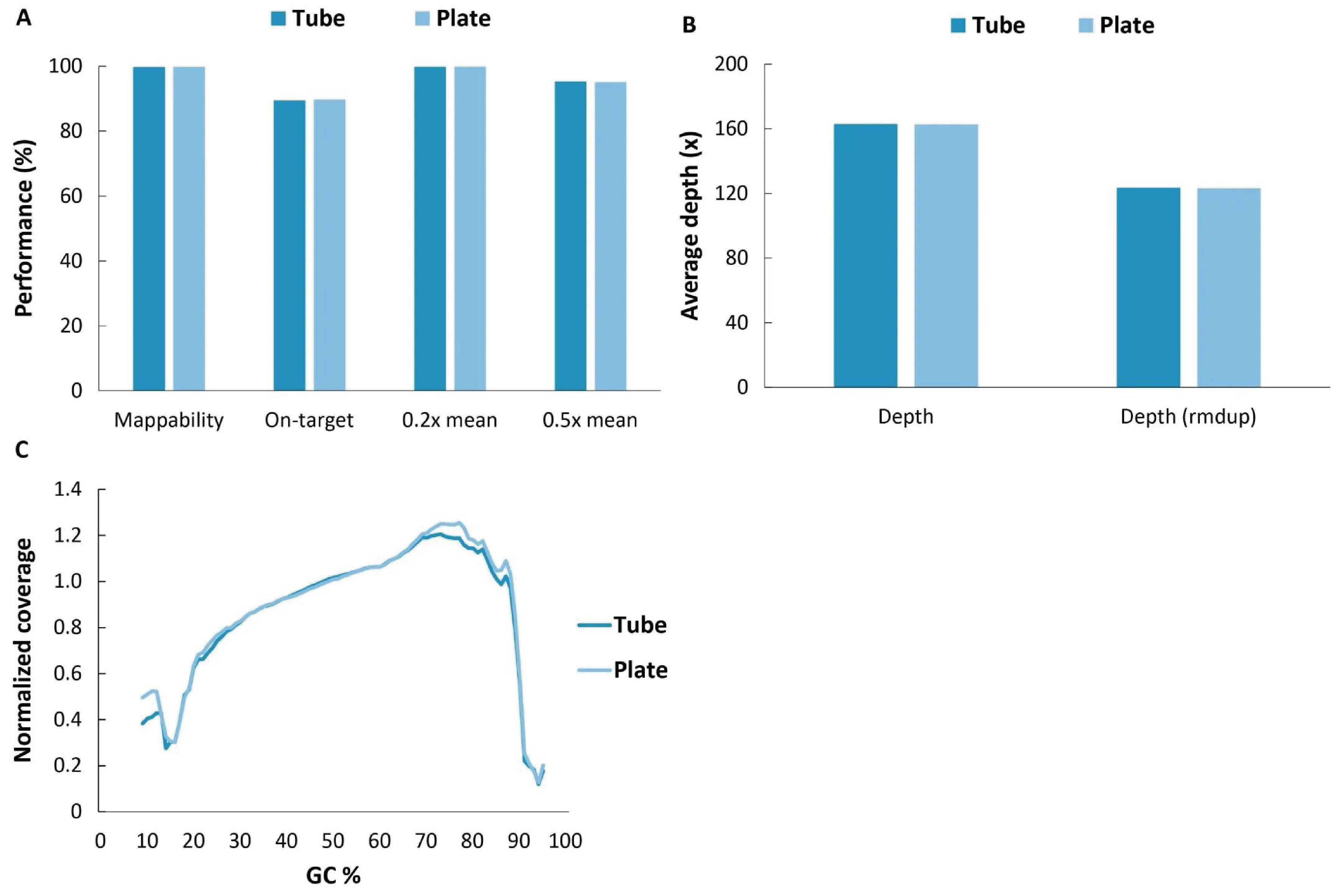 图 5. NadPrep® DNA 文库构建板式试剂盒与管式试剂盒的捕获表现基本一致。A. 捕获数据比对率、中靶率和靶区域覆盖度;B. 平均测序深度;C. GC 偏好性。