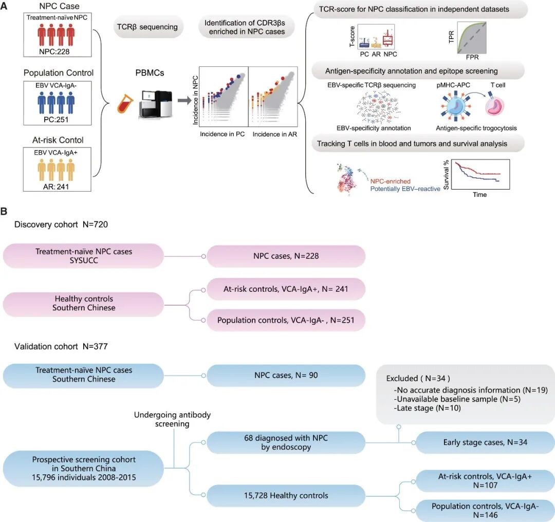 鼻咽癌 (Nasopharyngeal carcinoma,NPC) 主要由 EB 病毒 (Epstein-Barr virus,EBV) 感染引发的鼻咽上皮细胞克隆性增殖所致,EBV 感染被认为是肿瘤发生的早期关键事件。尽管早期 (I/II期) NPC 患者预后良好,但晚期 (III/IV 期) 患者仍面临较高的远处转移和复发风险。遗憾的是,由于早期症状不明显,仅有不到 20% 的 NPC 患者能获得早期诊断。因此,开发能够在高发地区人群中实现 NPC 早期检测的生物标志物具有重要意义。