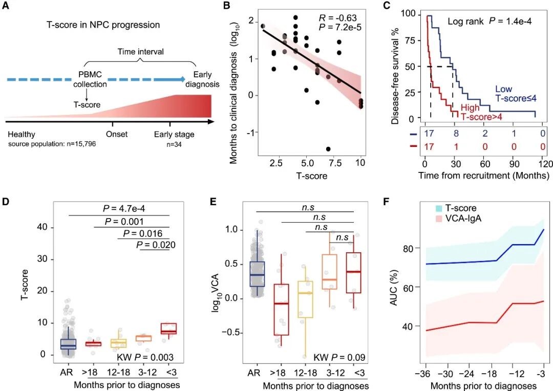 注:A. T-score 评估与 NPC 早期确诊时间间隔;B. T-score 与入组到临床确诊时间间隔的相关性分析;C. Kaplan-Meier 曲线;D-E. 按从基线到临床确诊的时间间隔分层,比较高风险对照 (AR,n = 348) 和前瞻性队列病例 (n = 34) 中 T-score (D) 与 EBV VCA-IgA 水平 (E) 的分布;F. 不同基线至临床确诊时间间隔下,T-score 和 VCA-IgA 的时间依赖性 AUC。实线为点估计,阴影区域为 95% 置信带。