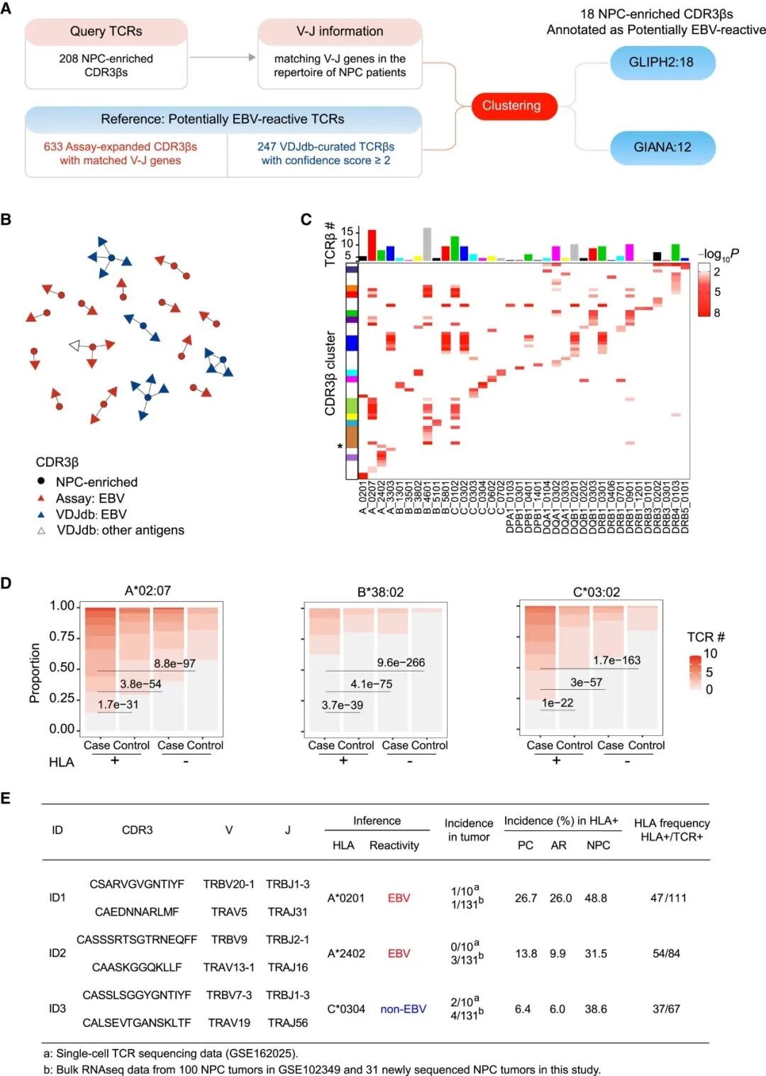 注:A. NPC 富集型 TCRs 的 EBV 特异性注释及 GLIPH2 和 GIANA 聚类分析流程;B. NPC 富集型 TCRs 的聚类分析及特异性注释;连线表示这些序列被 GLIPH2 归为同一聚类;C. NPC 富集型 TCRs 与 HLA 关联分析热图;上方柱状条表示与每个 HLA 等位基因显著关联的 TCRβ 序列个数。左侧彩色条表示共有 CDR3β 的 TCRβ 聚类。星号标注的 CDR3β 在使用不同 TRBV 基因时与不同 HLA 等位基因相关;D. 携带特定 HLA 等位基因阳性 (+) 或阴性 (-) 的 NPC 患者和健康对照者中,HLA 相关 NPC 富集型 TCRβ 序列的携带数量分析堆叠图;E. 用于功能验证的三对 NPC 富集型 TCRɑ/β 全长序列信息。