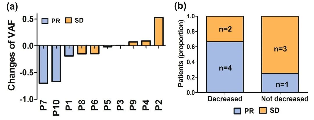 图 3. 洛拉替尼治疗开始后 T1 ctDNA 水平的变化。(a) 每例患者的平均 VAF 和最佳反应的变化。(b) T1 中 ctDNA VAF 降低与肿瘤反应之间的关系。