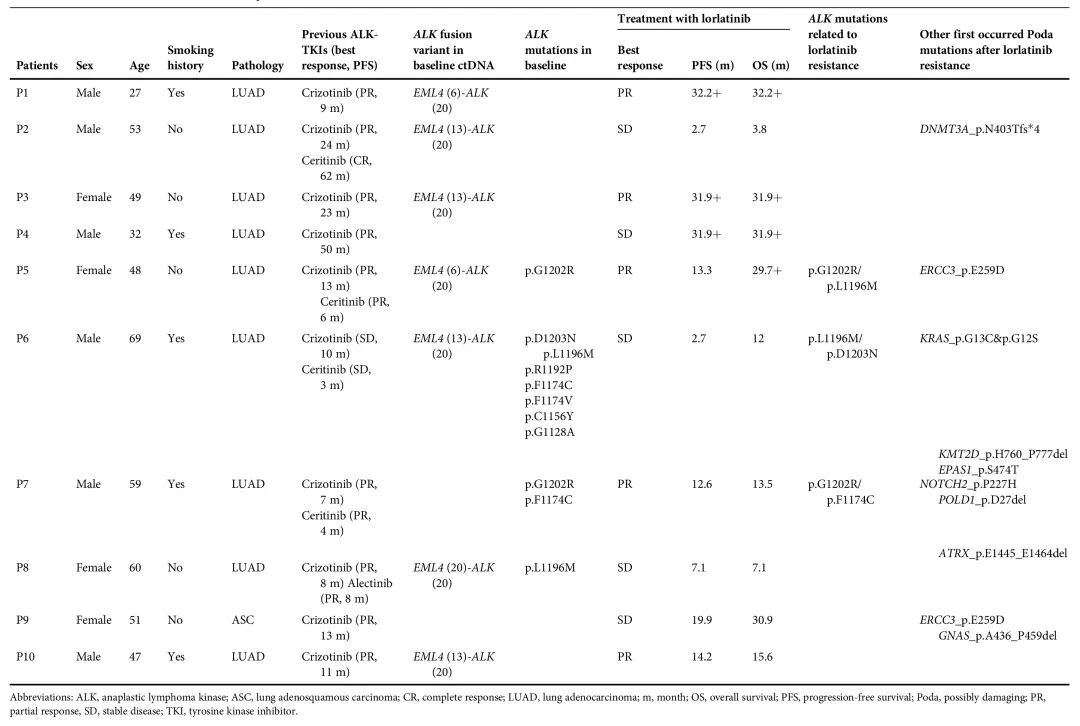 10 例 ALK 阳性晚期 NSCLC 患者 (均对一/二代 ALK-TKIs 耐药),既往接受洛拉替尼治疗至少 42 天。在洛拉替尼治疗前、治疗期间及疾病进展时共采集 38 份外周血样本。