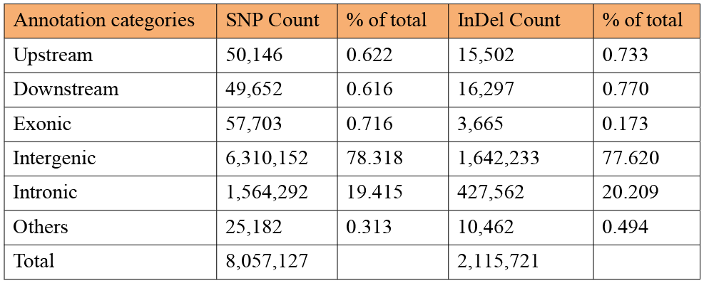 表 3. SNP 和 InDel 在不同功能注释类别中的分布情况。