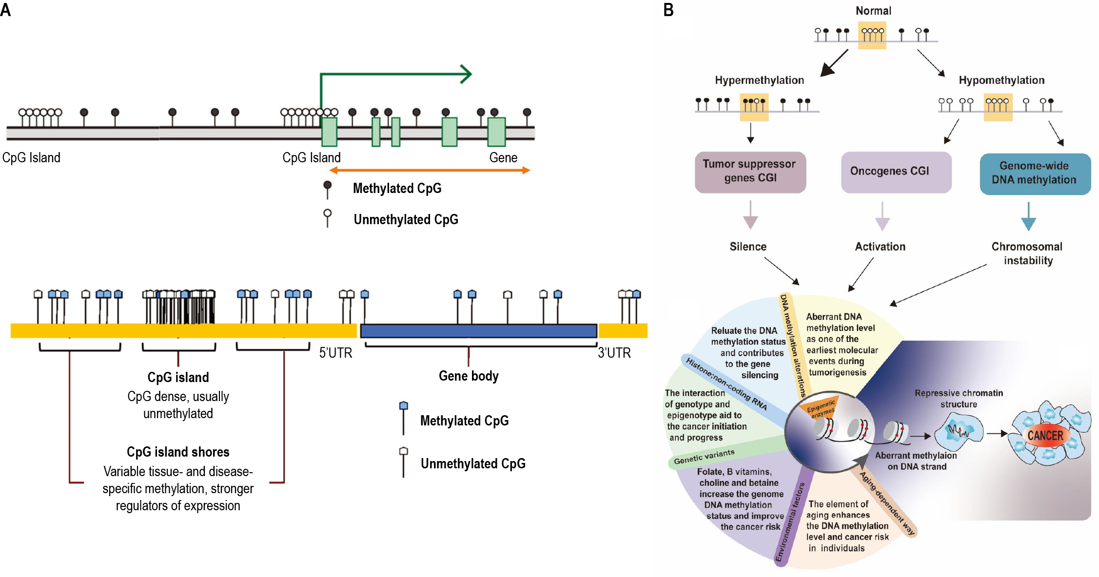 图 1. DNA 甲基化概览。A. 典型的哺乳动物中 DNA 甲基化模式图谱[1];B. 癌症发生中的 DNA 甲基化异常概述[2]。