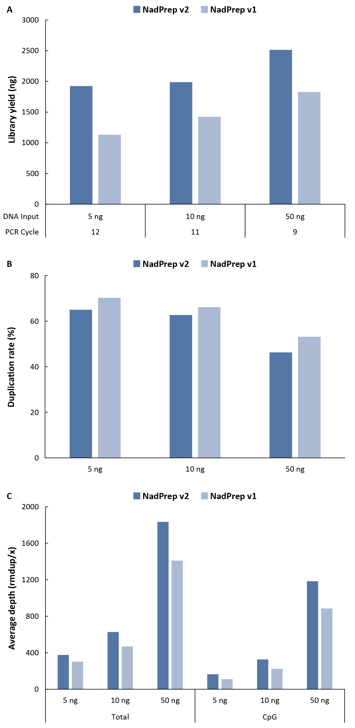 我们采用了 NadPrep® Methyl Stubby Adapter (UDI) Module v2 (for Illumina®) (NadPrep v2) 和 NadPrep® Methyl Stubby Adapter (UDI) Module (with 10 nt Index) (NadPrep v1) 对不同起始量的 gDNA 样本进行甲基化文库制备。结果显示,在不同起始量条件下,NadPrep v2 无论是在文库产出、重复率还是平均覆盖深度表现上较 NadPrep v1 都有不同程度的提升,提供了更强的技术方案支持,满足高精度甲基化检测需求。