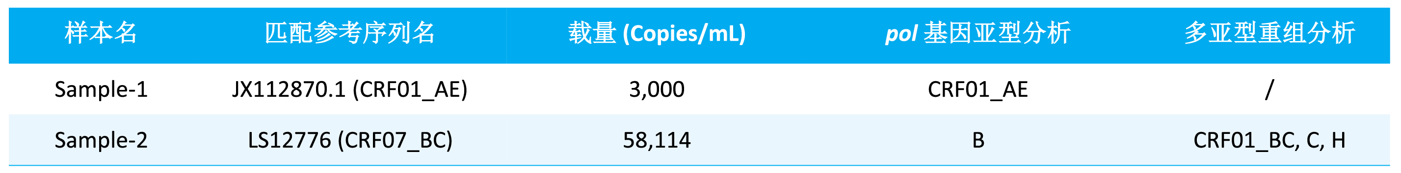 μCaler® HIV-1 全基因组检测一体化解决方案结合全长基因组序列与 pol 基因分析,已成功鉴定出多种亚型和流行重组型,包括:B, C, CRF01_AE, CRF07_BC, CRF08_BC, CRF55_01B, CRF59_01B, CRF65_cpx, CRF68_01B 和 CRF85_BC。以 2 例临床来源的 HIV 核酸样本为代表进行亚型分析展示 (表 2.),结果显示,部分样本在基于全长基因组序列的亚型判定结果与仅基于 pol 基因的分型结果之间存在不一致性,这类差异通常提示该病毒株可能为多亚型重组病毒。