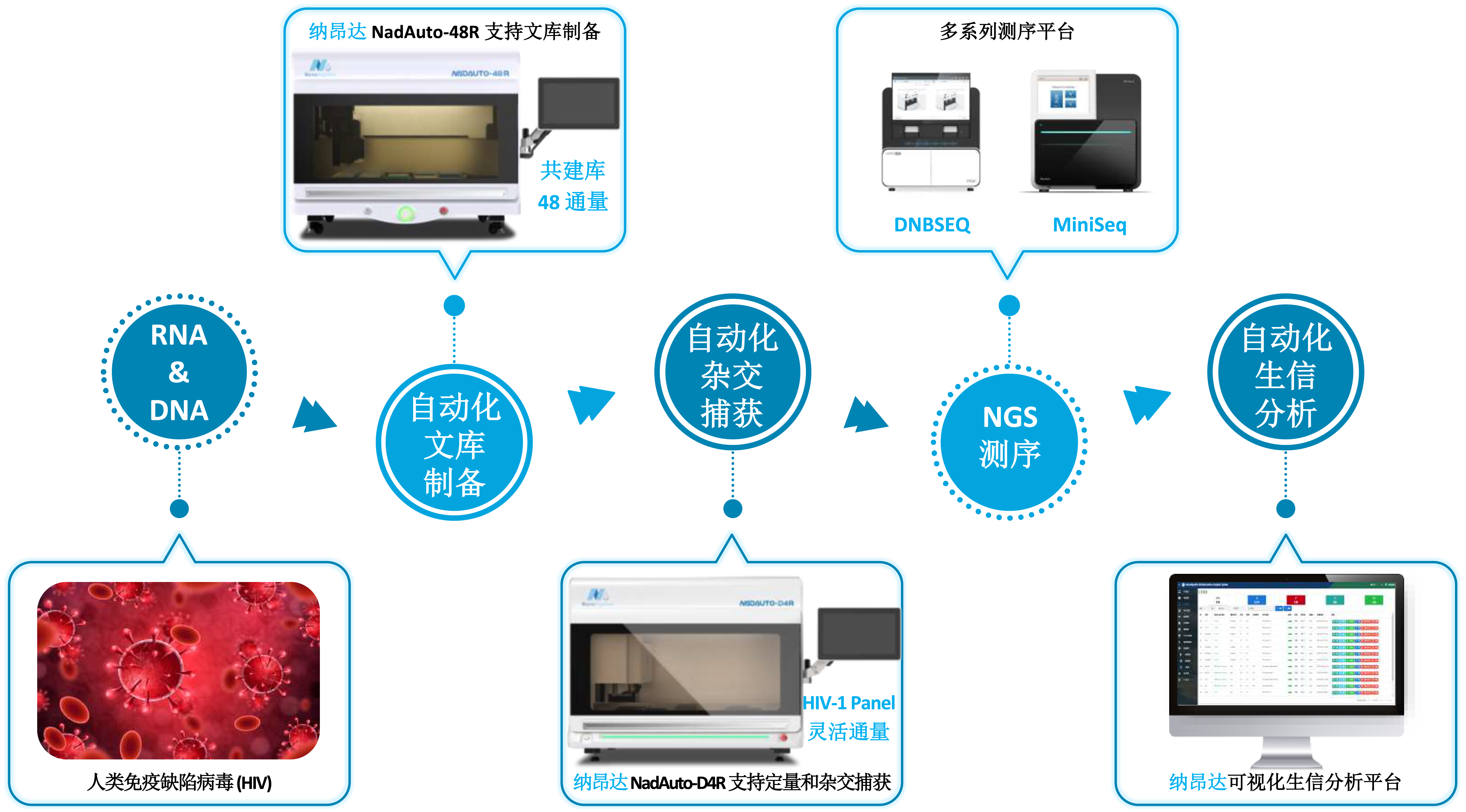同时,依托纳昂达灵活多样的 NadAuto 系列全自动 NGS 工作站也可进一步简化实验操作流程,降低人工干预强度,释放实验室人力资源,提升临床检测通量与效率,并减少人为误差及职业暴露风险,为 HIV 流行病学溯源研究和传播风险评估提供高效、可靠的方案支持。